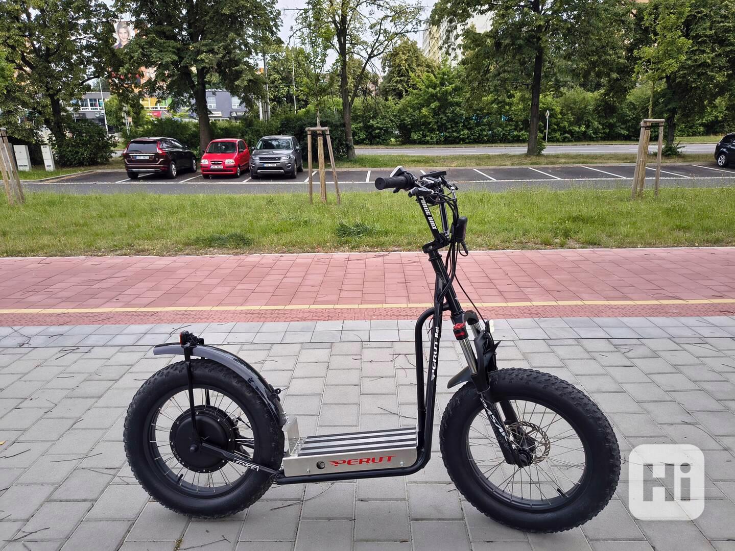 Elektrokoloběžka PERUT BAT s baterií 27 Ah (Samsung), dojezd s jezdcem o hmotnosti 93 kg - 88 km (měřeno přes GPS), nosnost maximálně 120 kg, výkon motoru 1200W, maximální rychlost 37 km/h, (možnost zavřít na 25 km/h), hmotnost 26 kg